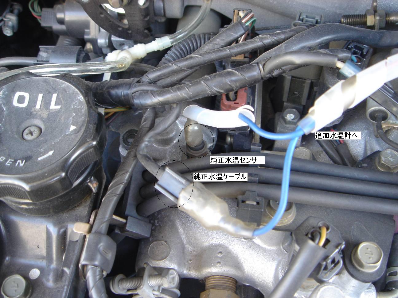 | 純正の水温計用配線に割込みをするだけです。厳密には悪いかもしれません。 |