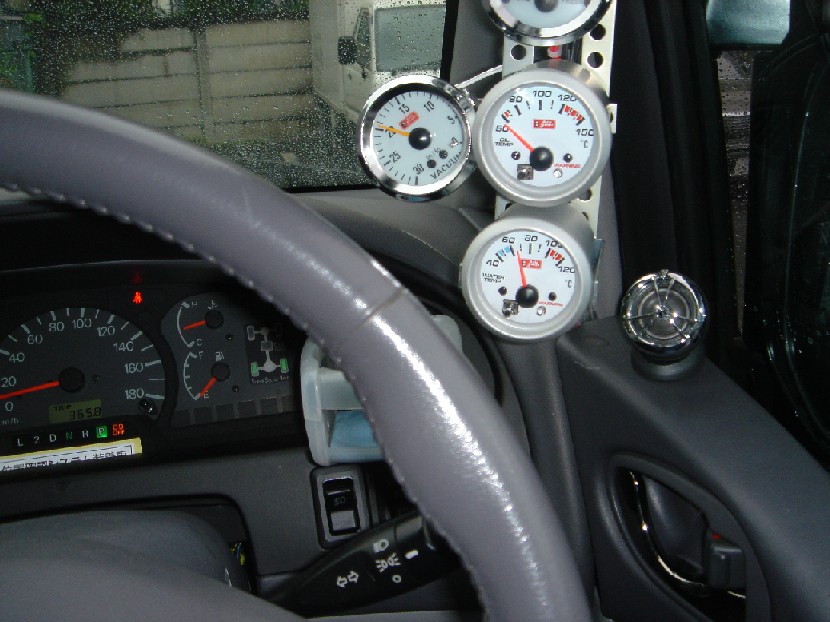 | ・純正のコネクタを抜く ・配線を室内に引き込む ・二股ケーブルを自作し、接続する ・電源とイルミ用電源を接続する ・メータを設置する。 |